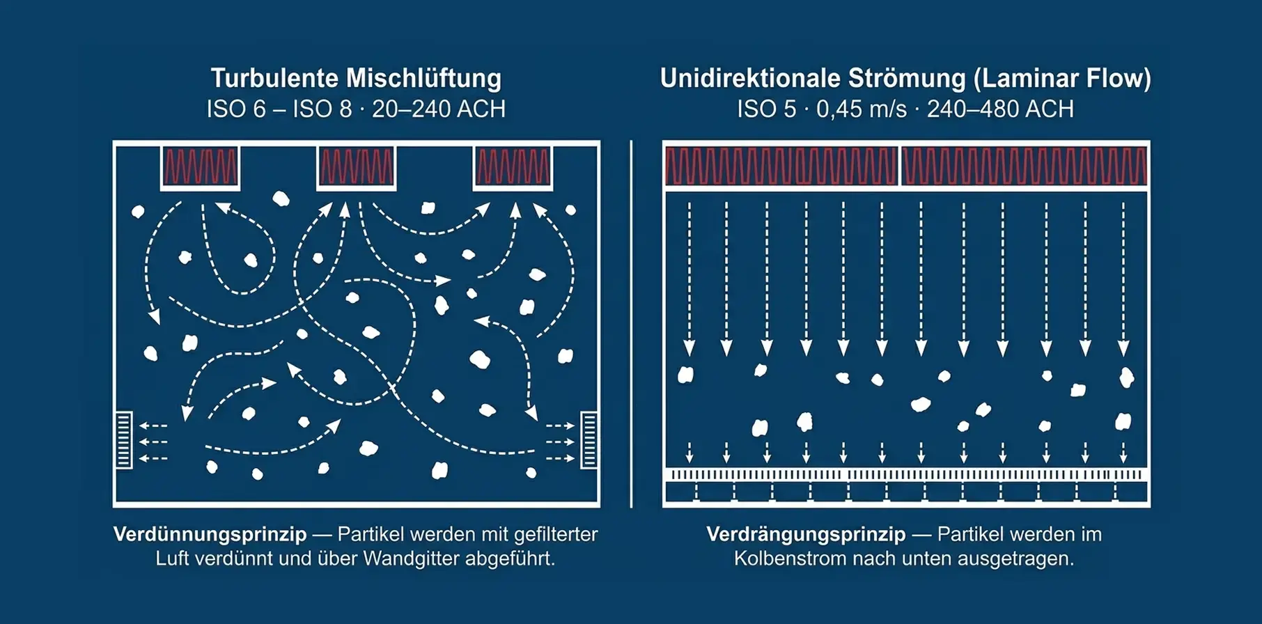 Die Tabelle zeigt einen architektonischen Bruch zwischen ISO 6 und ISO 5. Für ISO 6 bis ISO 8 reicht das Prinzip der turbulenten Mischlüftung. Gefilterte Luft strömt über Drallauslässe ein, mischt sich mit der Raumluft, verdünnt die Partikelkonzentration und wird über Bodenkanäle abgeführt. Bei ISO 5 versagt das Mischprinzip. Hier ist eine turbulenzarme Verdrängungsströmung (Laminar Flow) erforderlich: 35 % bis 70 % der Decke mit H14-FFUs belegt, vertikale Strömung mit 0,45 m/s ± 20 %.
